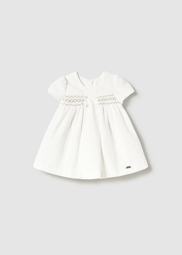¡Divino vestido de terciopelo, elegante y clasico! De cuello redondo, manga corta, con detalle de nido de abeja en el pecho y cierre de ziper en la parte trasera para una puesta ágil y rápida.