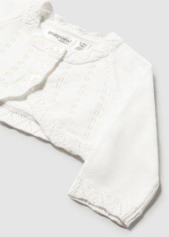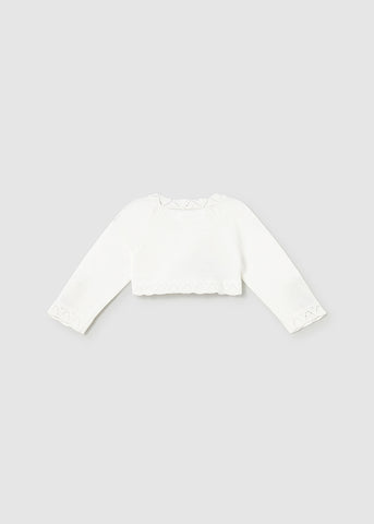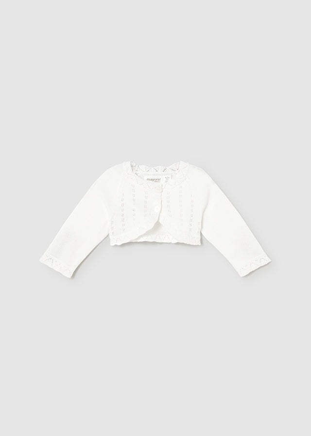¡Divino torerito con motivos calados unicos! De cuello redondo, manga larga, diseño corto de tipo bolero, cierre con botones en la parte delantera. Un "must-have" en el guardarropa de las niñas, ya que son prendas básicas y esenciales en su armario para completar cualquier look.