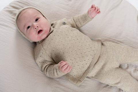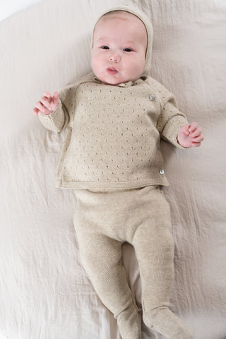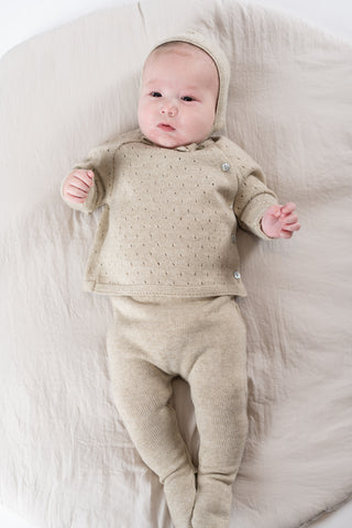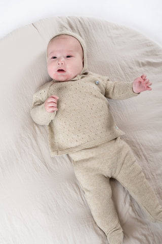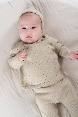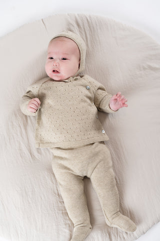 ¡Tierno y encantador conjunto tipo tejido de 3 piezas! ¡Pensado para recibir a tu bebe y sacarlo del hospital con el! Suave tejido al tacto para la piel delicada de tu bebe, blusita con cierre de botones por un lado, detalle de patrones con pequeñas aberturas con sus pantaloncitos con pie a juego, elastico en la cintura para mejor ajuste y con su gorro a juego con listones ajustables para evitar perdidas y caidas ¡El look mas completo para los mas chiquitos!