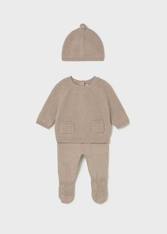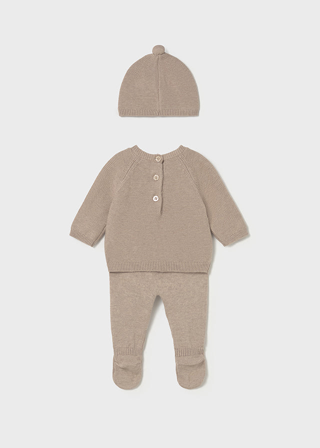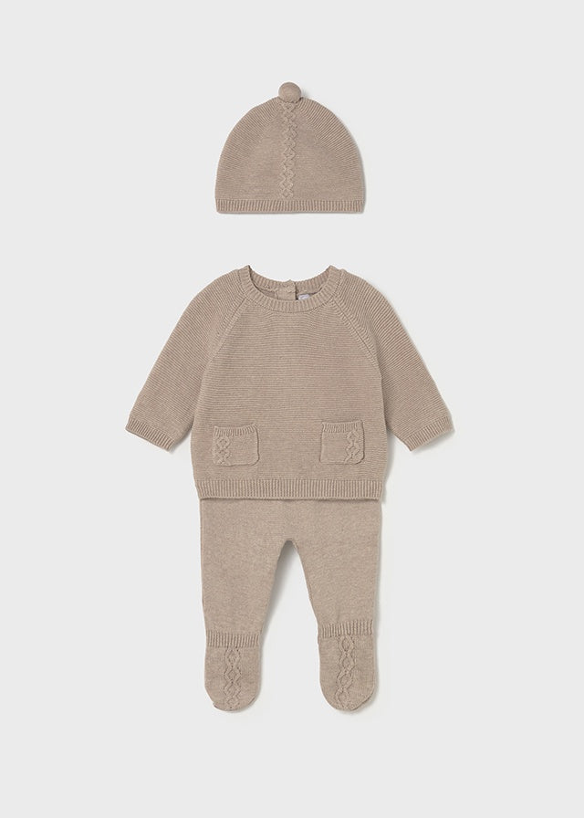 ¡Hermoso y tierno conjunto tejido de 3 piezas a juego! Parte de arriba tejida de punto con relieve, cuello redondo, manga larga y sus pantalones a juego, elastico en la cintura para mejor ajuste. Y su gorrito a juego, un accesorio combinable y versátil, ideal como complemento de cualquier look.