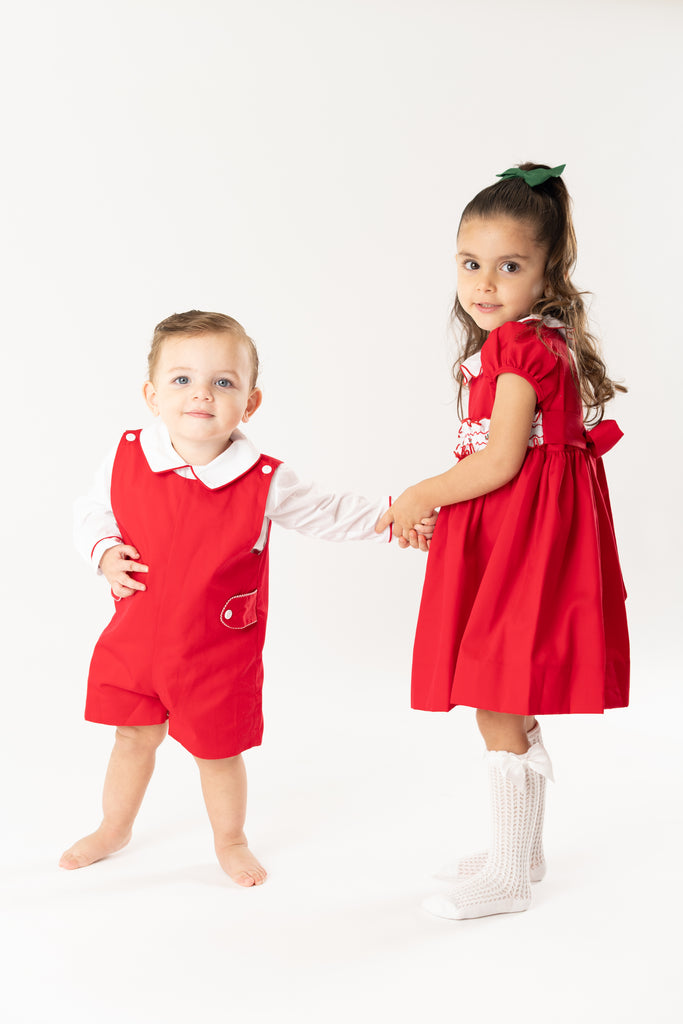 ¡Divino conjunto de overol su camisa a juego! ¡De colores navideños ideal para esta epoca! Camisa de manga larga, cuello camisero, cierre de botones por atras. Y su overol de tirantes gruesos con botones, detalle a los lados, cierre de botones a presion en la entrepierna.