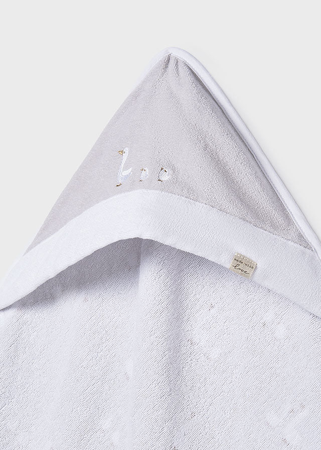 ¡Hermosa toalla con capucha de tierno diseño infantil! Diseño envolvente con la que podrás secar y abrigar a tu bebé después del baño. Capucha con diseño bordado, estampado por fuera y por dentro de color liso.